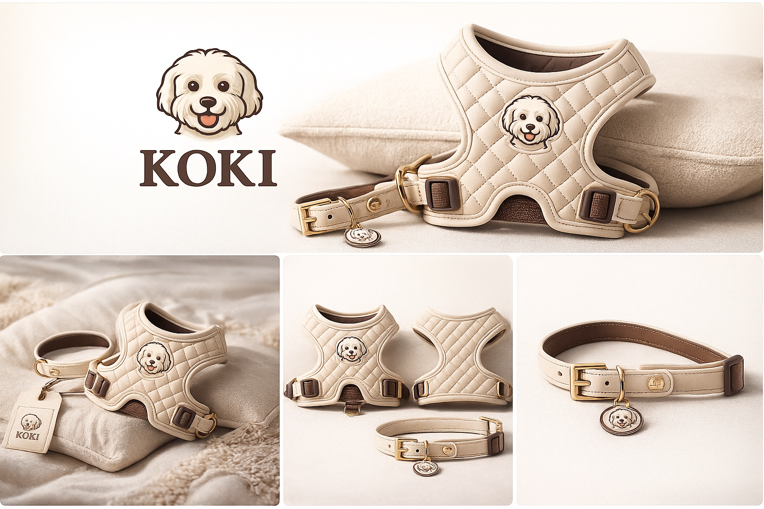 A quilted beige harness and collar set designed to wrap your pup in comfort, safety, and love.